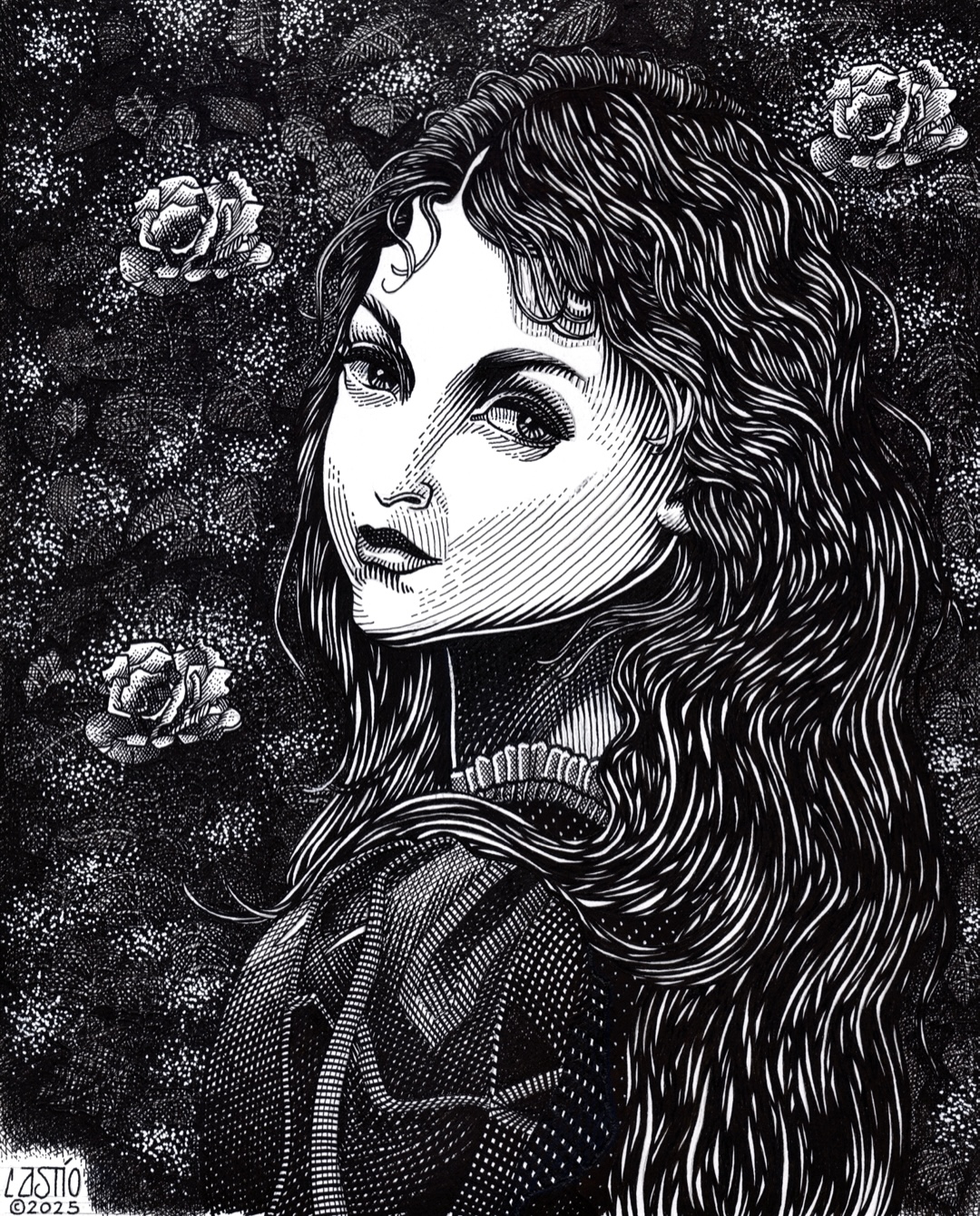 Entre Sombras II. Three years after first embracing a Pre-Raphaelite aesthetic with the original Entre Sombras, the artist has returned to the image to create a new version — one that reflects the evolution since that creative milestone in 2022. Entre Sombras II embodies the best qualities of the artist’s mature style and draughtsmanship, as well as the aesthetic he has worked to cultivate. It speaks with a voice that is both authentic and modern, while remaining rooted in the rich tradition of line and design that has inspired the artist for decades.