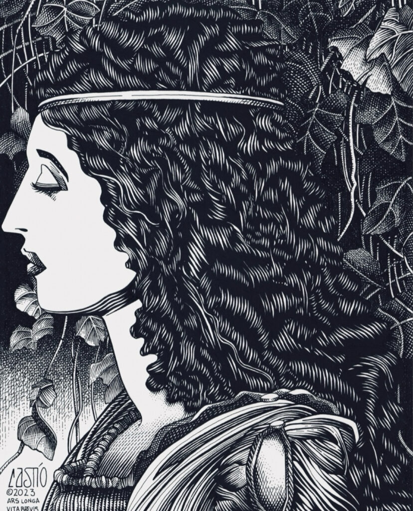 La Maja Soñadora. 2023. Pen and ink, and gouache on paper. 9″x12″.